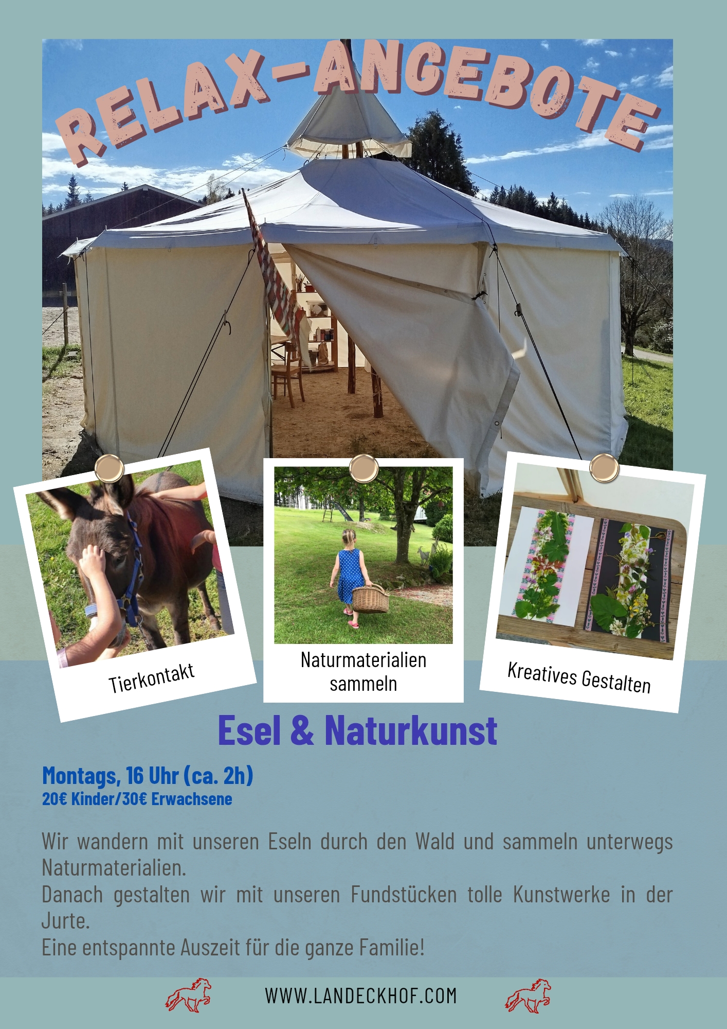 Wir laufen mit unseren zwei Eseln durch den Wald und sammeln dabei schöne Gegenstände aus der Natur. Im Anschluss gehen wir in die Jurte und machen aus unseren Schätzen tolle Kunstwerke.