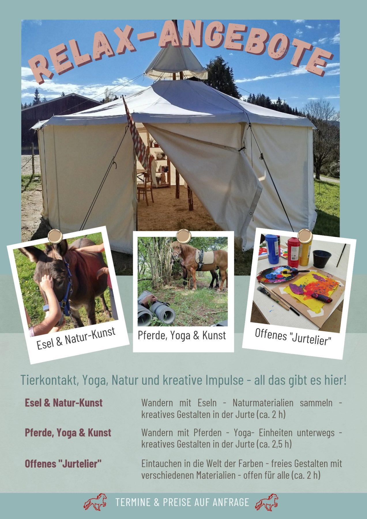 • Wir führen die Pferde durch den Wald und üben uns in Stille. Unterwegs gibt es kleine Yoga- und Reiteinheiten. Dabei nehmen wir unseren eigenen Körper und den des Pferdes ganz genau wahr. Unsere Erfahrungen bringen wir danach beim kreativen Gestalten in der Jurte zum Ausdruck.